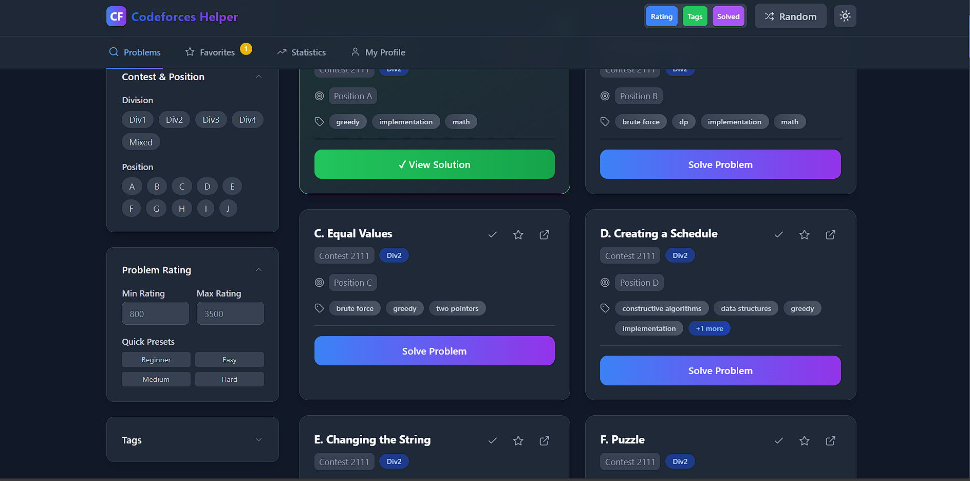 A powerful web application for competitive programmers to discover and practice problems from Codeforces. Features include advanced filtering by contest division, problem rating, and tags, along with a clean, responsive interface with dark/light mode support.